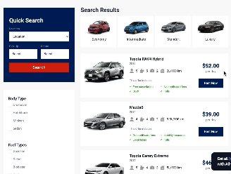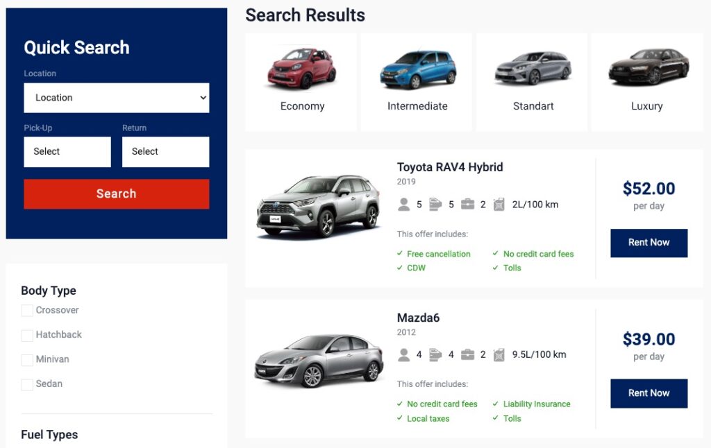 ここではレンタカーをいろいろな角度で検索して、その結果から予約するシステムを見ていきます。