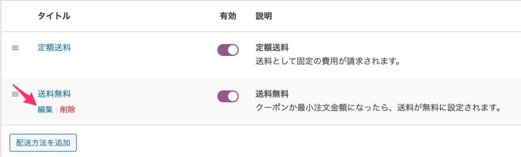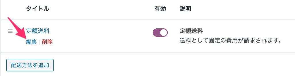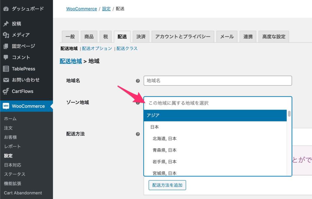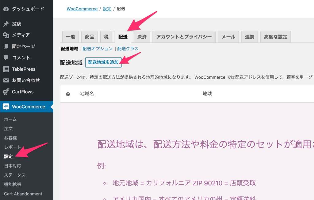 - Woocommerceの設定から「配送」のタブに移動します。