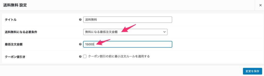 - 最低注文金額を入力します。ここでは15000円以上購入で送料無料で設定しました。