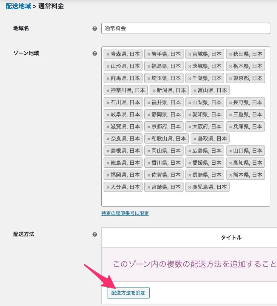 - 「配送地域を追加」をクリックします。