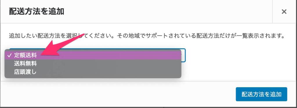 - 定額送料を選択して、「配送方法を追加(青)」をクリックします。