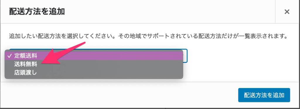 - 通常料金を設定したときと同じように「配送方法を追加(白)」から、今度は「送料無料」を選択して「配送方法を追加(青)」をクリックします。