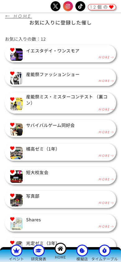 各催しにお気に入りに追加するボタンを設置し、お気に入りを一覧で見ることができるようにしました。