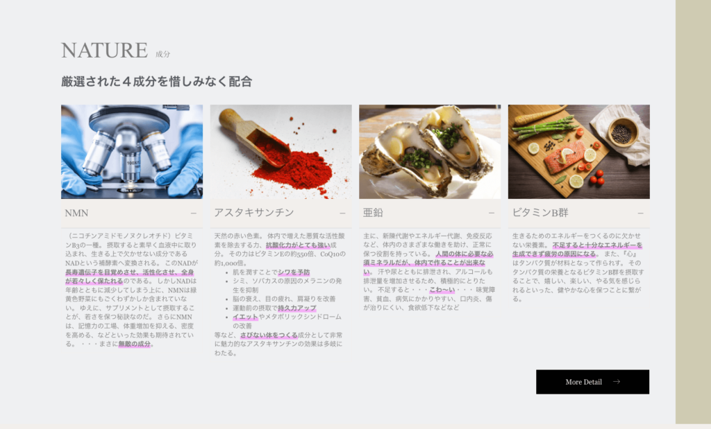 NATURE(成分)のセクションでは各成分についてアコーディオンの機能を使って、解説をあえて隠しています。